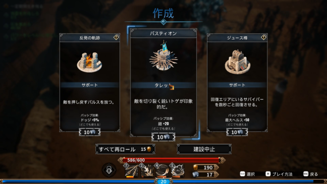 作れる建造物はランダムな3つの選択肢の中から選ぶ方式となっており、レベルアップ時に出てくる選択肢と同様にお金を支払う事でリロールする事が可能です。